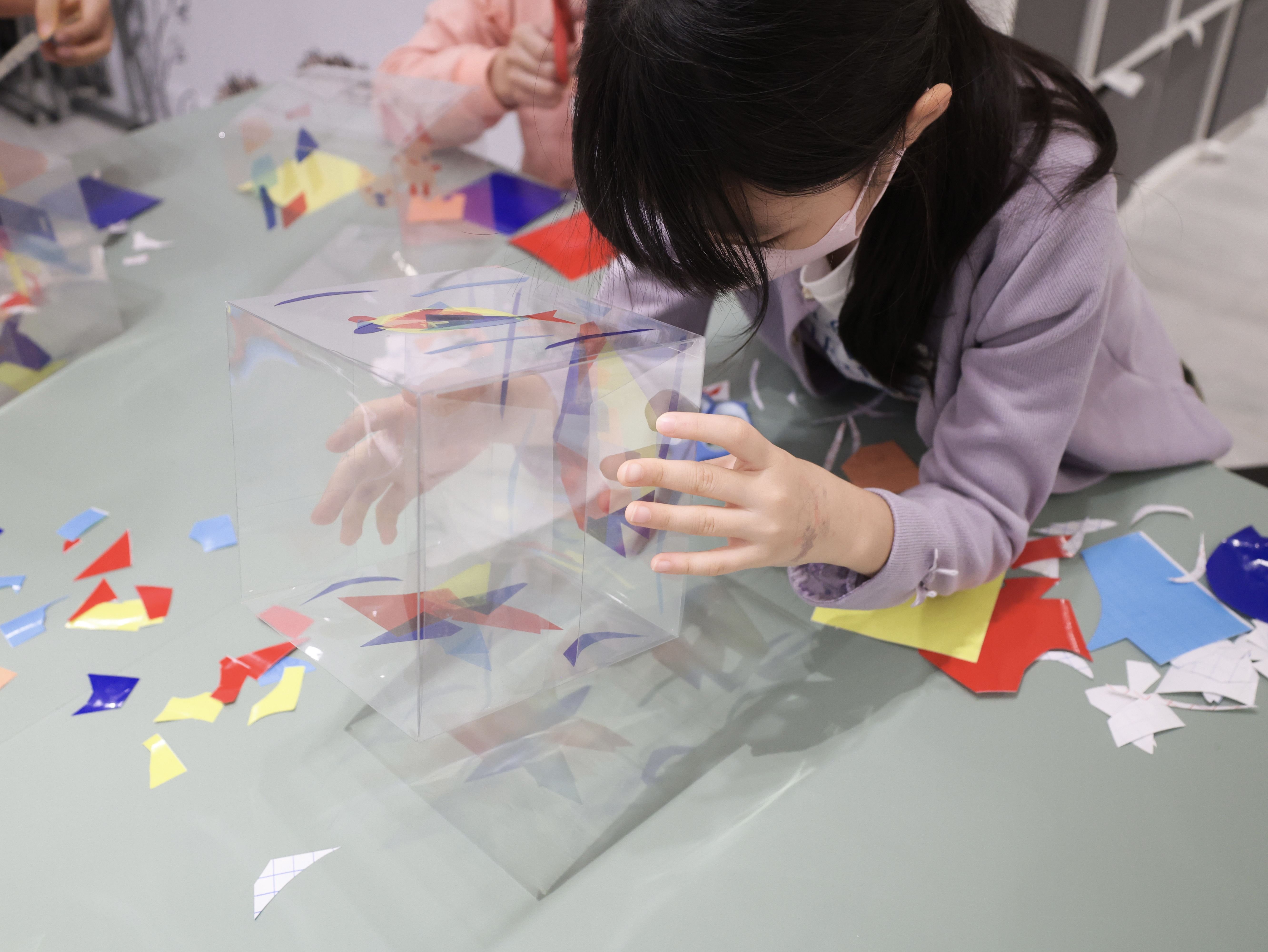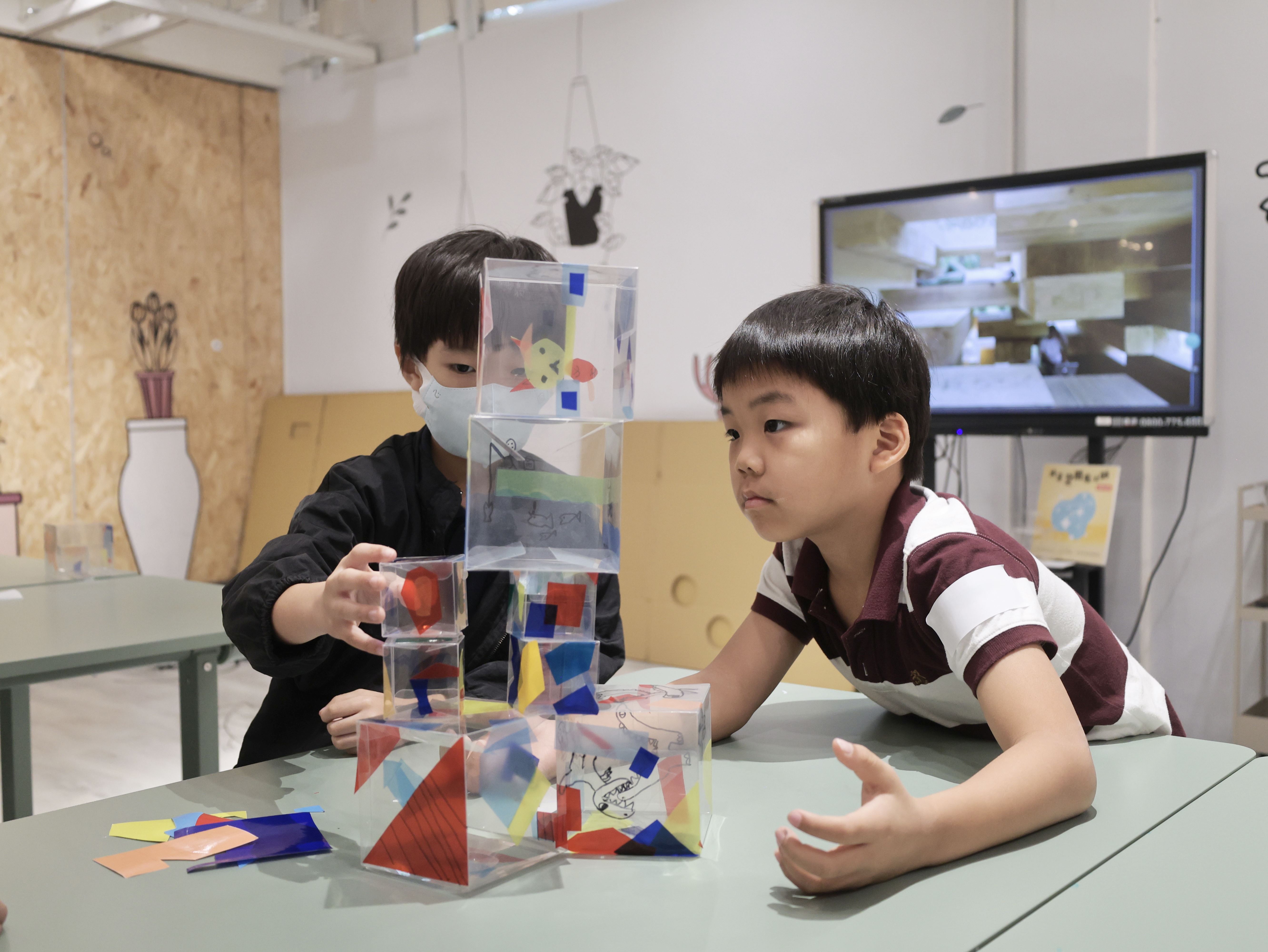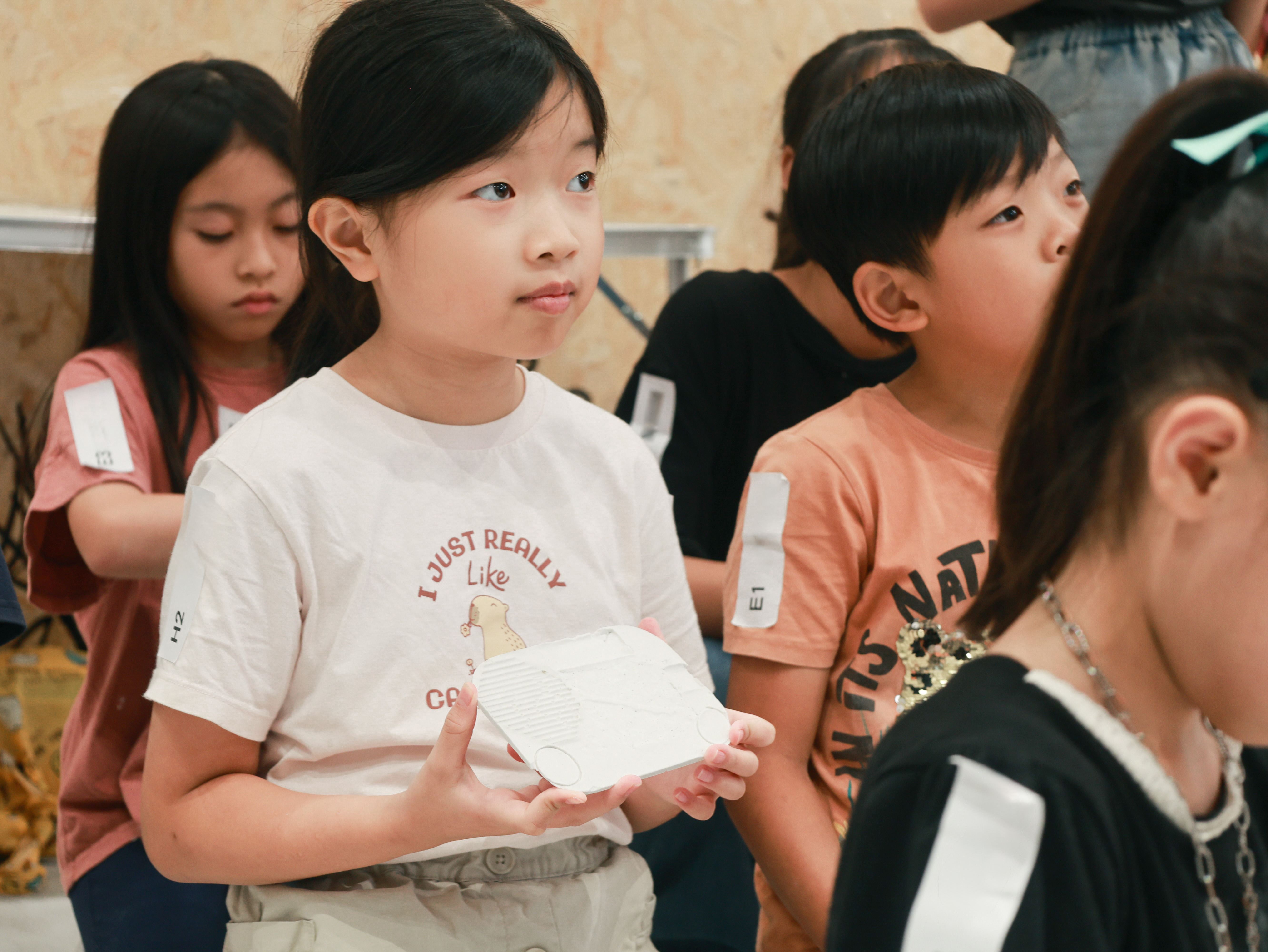 藝術家吳依宣則帶領孩子回顧「展台」的歷史,從功能性到設計演變,讓他們意識到展台並非只是擺放作品的台座,而是一種會影響觀眾觀看方式的媒介。延續上一場的成果,孩子們將自己的玩具作為展品,思考如何透過展示設計決定最佳的欣賞高度與呈現方式,並實際動手製作展台模型。這不只是設計練習,更是一次讓孩子站在觀眾立場思考「怎麼讓別人看見」的策展體驗。