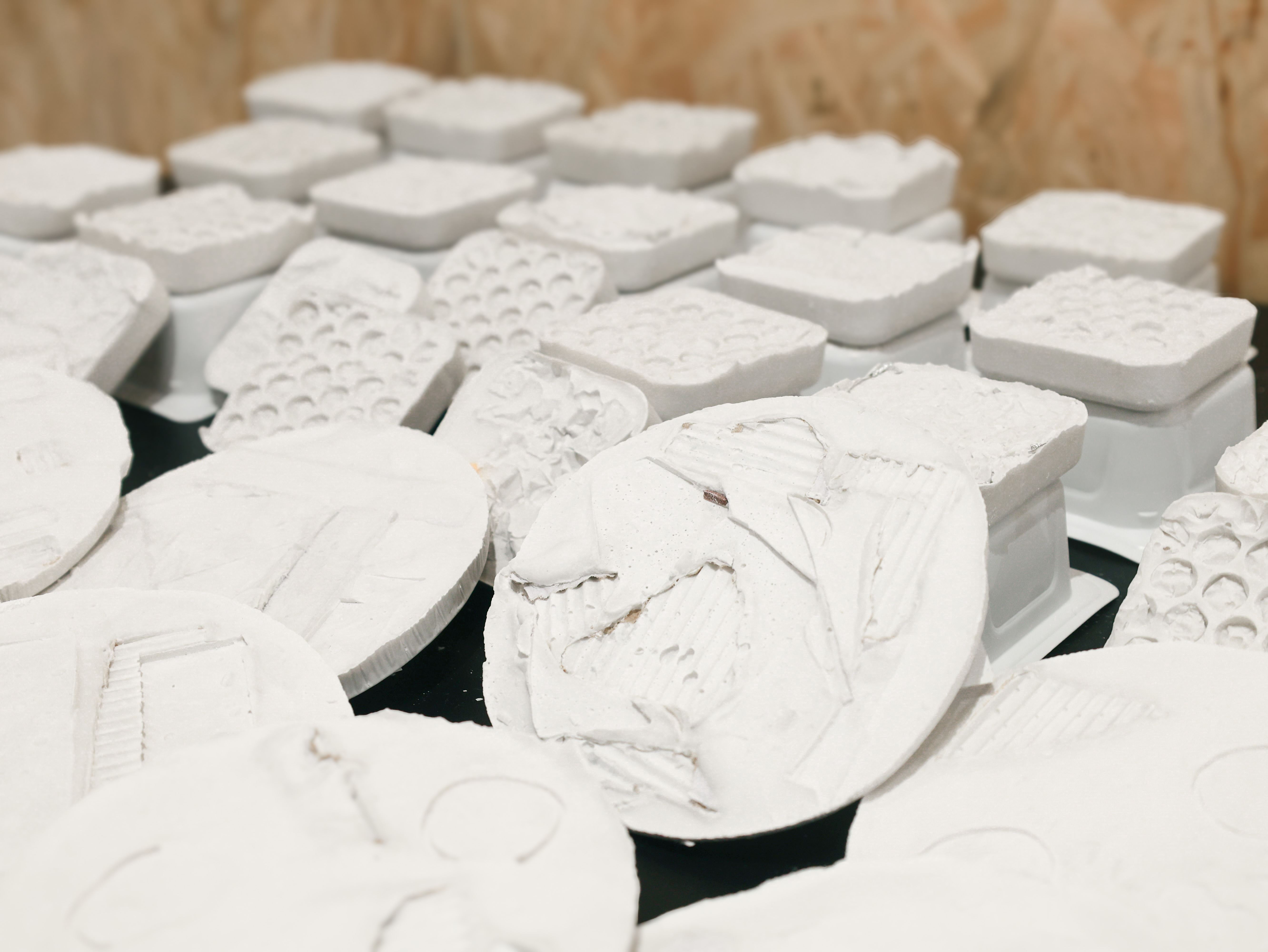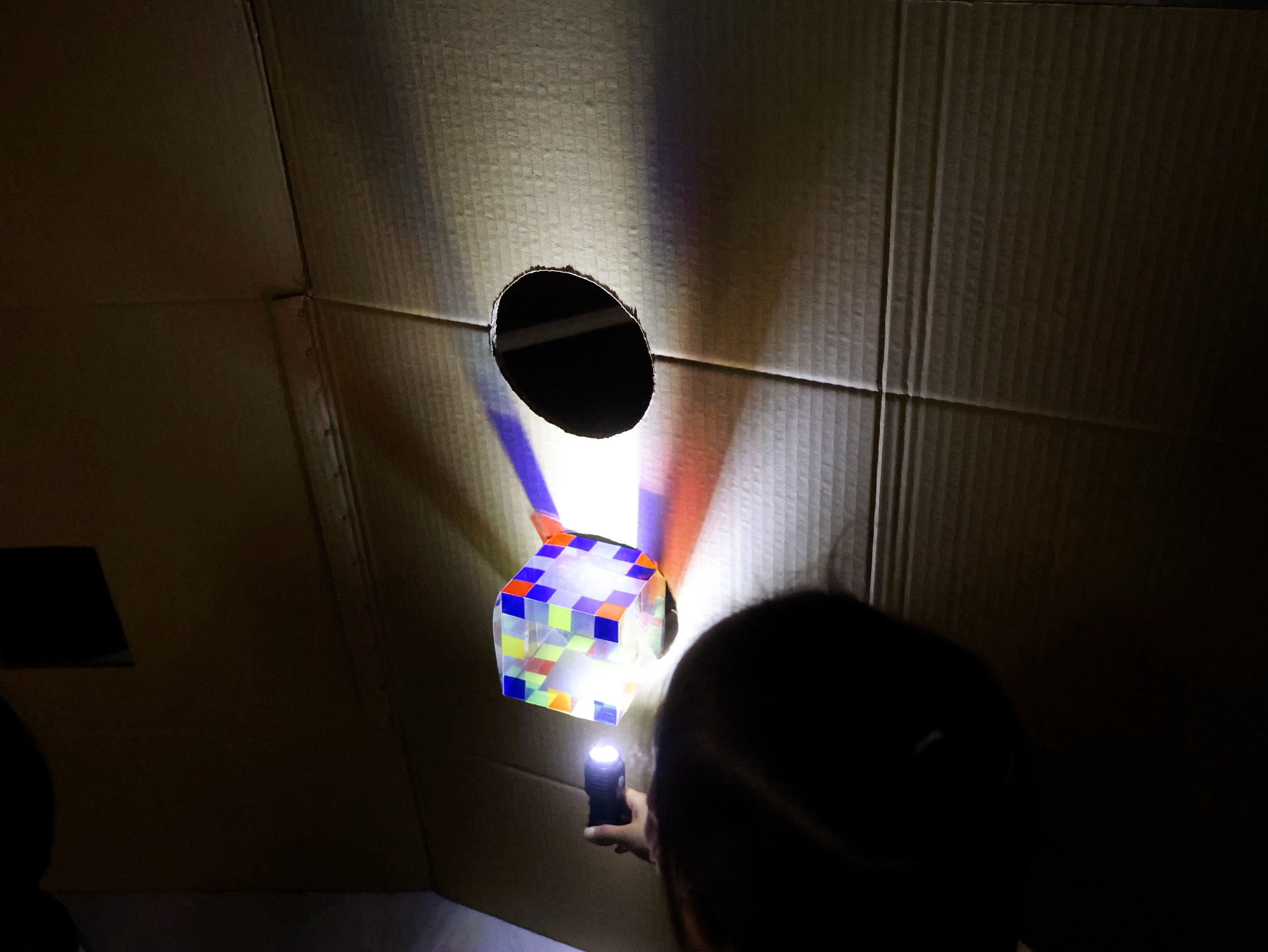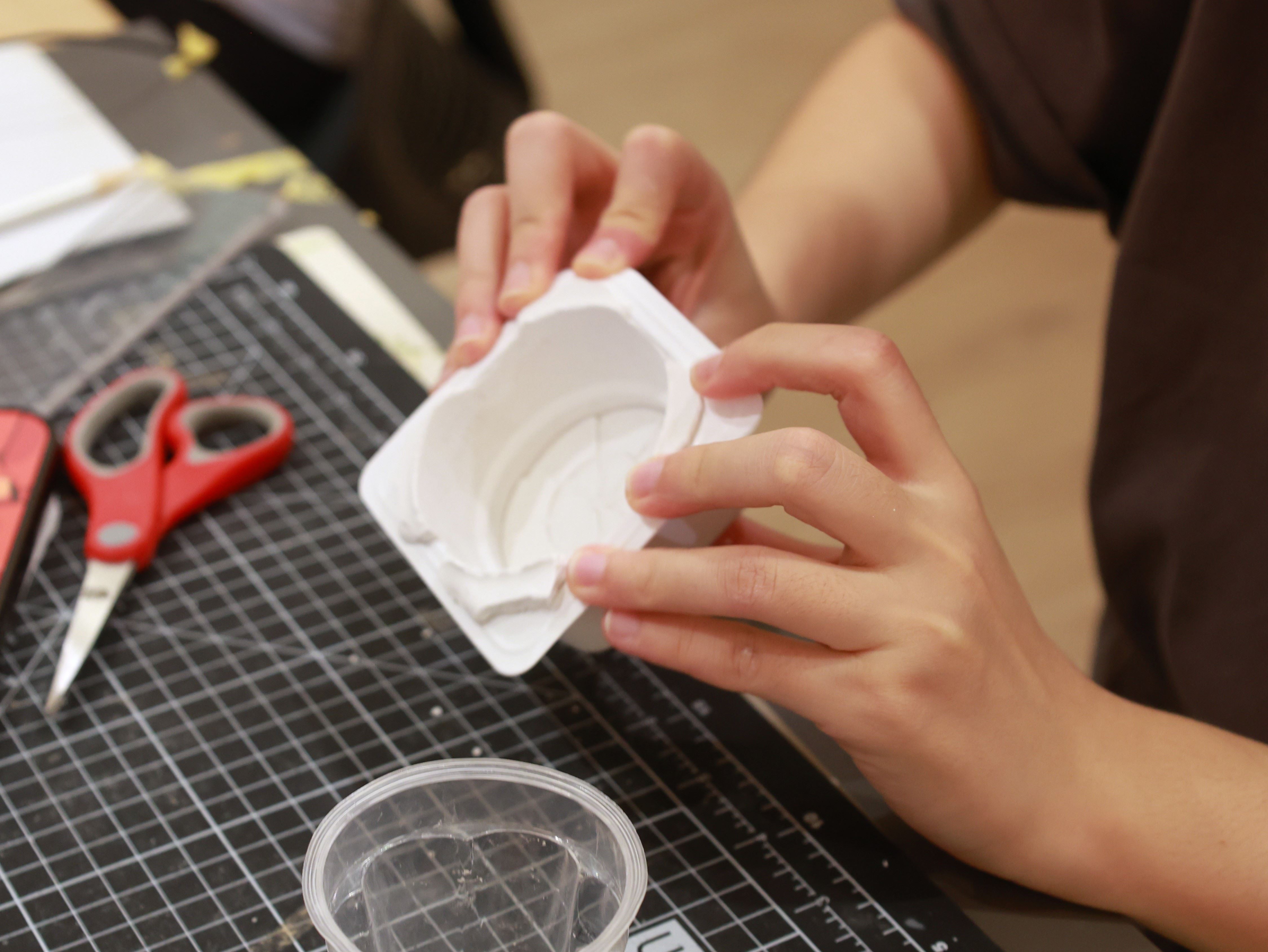 藝術家吳依宣則帶領孩子回顧「展台」的歷史,從功能性到設計演變,讓他們意識到展台並非只是擺放作品的台座,而是一種會影響觀眾觀看方式的媒介。延續上一場的成果,孩子們將自己的玩具作為展品,思考如何透過展示設計決定最佳的欣賞高度與呈現方式,並實際動手製作展台模型。這不只是設計練習,更是一次讓孩子站在觀眾立場思考「怎麼讓別人看見」的策展體驗。